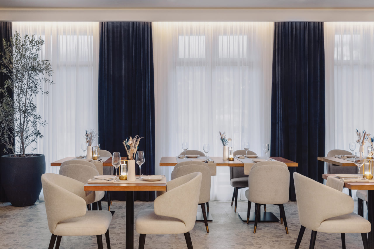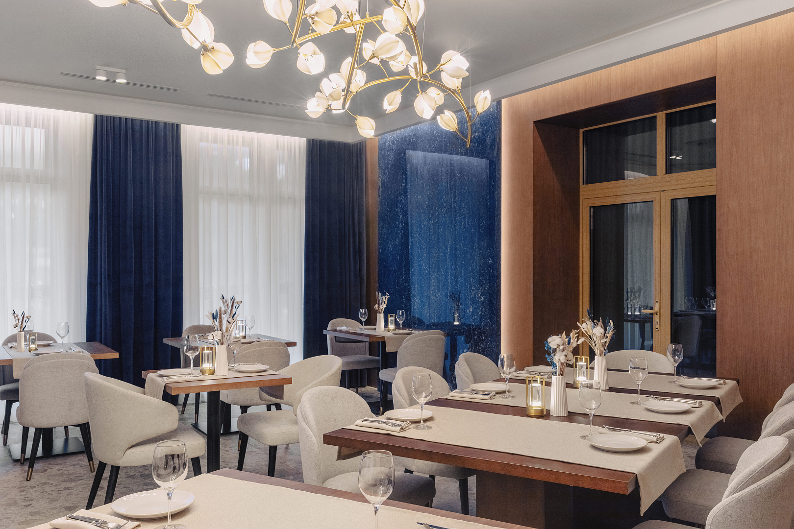 Элегантный зал ресторана, выдержанный в глубоких, изысканных тонах, словно вторит природной красоте камня лазурит. Элементы отделки из этого драгоценного камня тонко мерцают, создавая атмосферу утонченной роскоши и спокойствия.