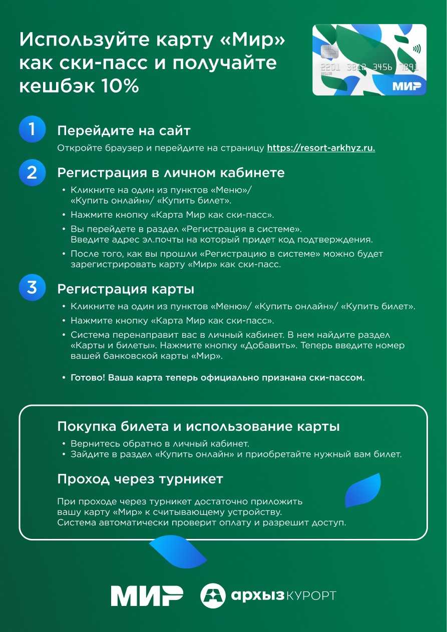 10% кэшбэк обратно на карту: после каждого пополнения ски-пасса картой «Мир» 10% от потраченной суммы вернутся вам на счёт! Это существенная экономия, которая позволит вам наслаждаться отдыхом на «Архызе» еще больше.